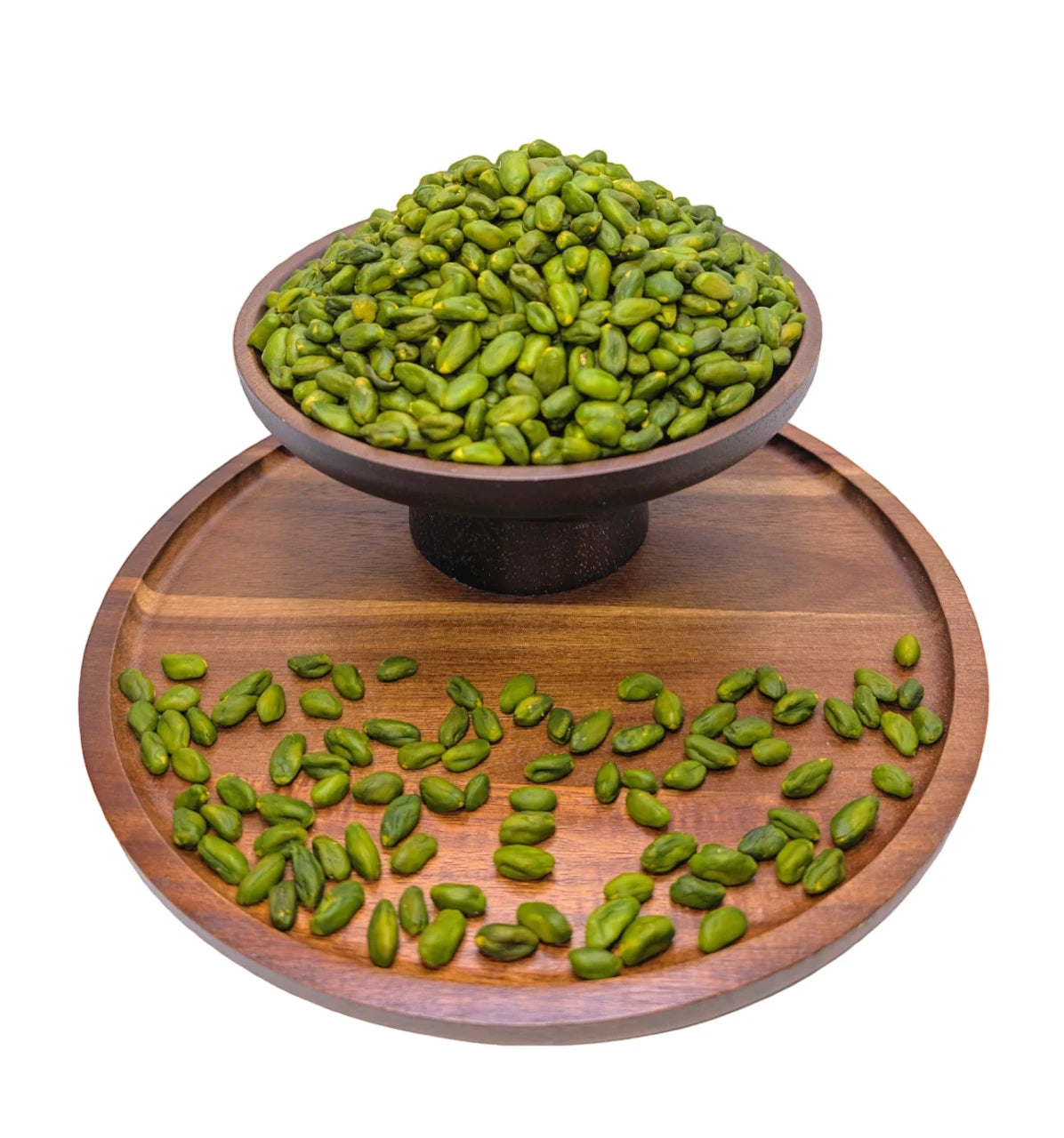 Pistazienkerne ohne Haut sind die inneren, essbaren Teile der Pistaziennuss, sorgfältig geschält und ungeröstet, um ihren natürlichen Geschmack und ihre zarte Textur zu bewahren. Diese grünen Kerne zeichnen sich durch ihren mild-nussigen und leicht süßlichen Geschmack aus, der sie zu einer beliebten Zutat in der Küche macht.